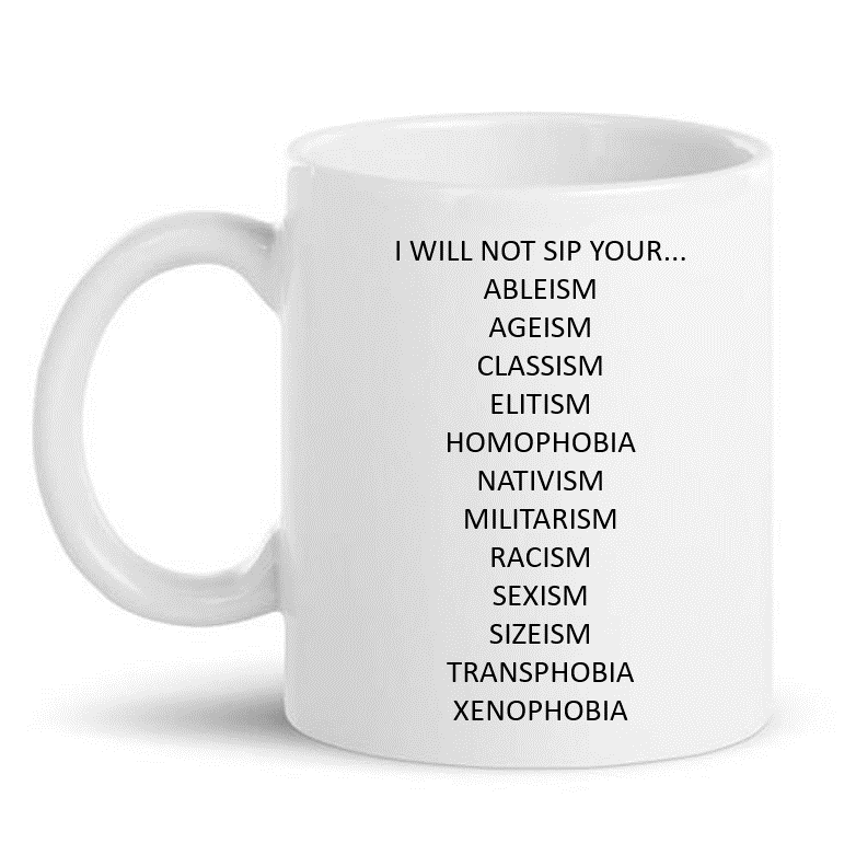 Cup of Diversity Mug (Original Design): 11oz Mug. Front side reads: I will not sip your ableism, ageism, classism, elitism, homophobia, nativism, militarism, racism, sexism, sizeism, transphobia, xenophobia. Opposite side has http://www.hinesgaitherconsulting.com printed in small black letters. $20.00 includes tax and shipping. Text is enlarged slightly here for readability. Don’t agree with every word? No problem! Use this mug to spark great conversations.