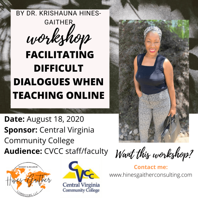 Dr. Krishauna Hines-Gaither will offer a workshop to the faculty and staff of Central Virginia Community College on how to navigate difficult dialogues and challenging content when teaching online. If you are interested in a similar offering, contact Krishauna here.