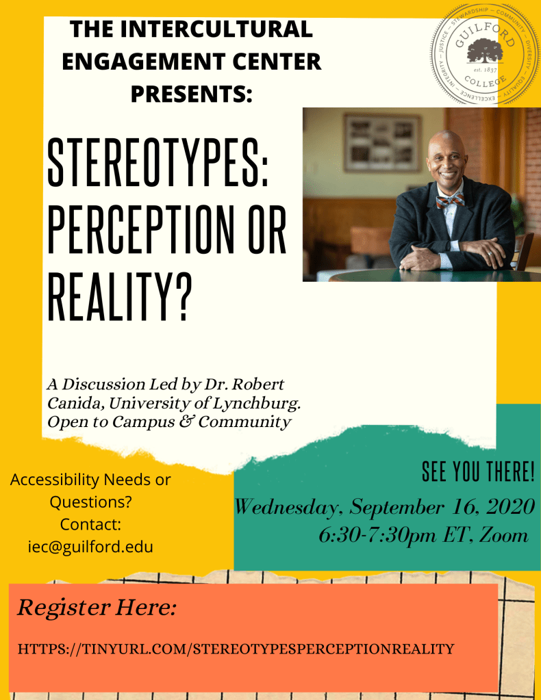 Join us for this amazing program on Stereotypes with Dr. Robert Canida, II of the University of Lynchburg. Free and open to the public. Sponsored by Guilford College’s Intercultural Engagement Center. REGISTER HERE: https://tinyurl.com/StereotypesPerceptionReality