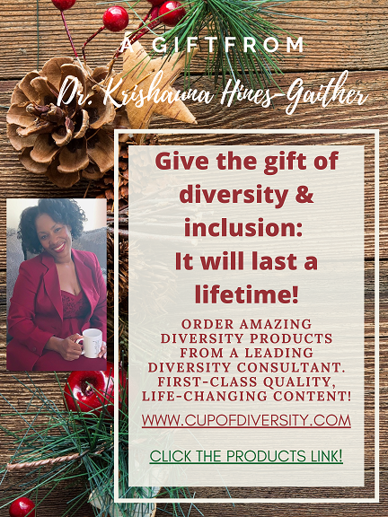 Give a gift that matters! Leading diversity consultant, Dr. Krishauna Hines-Gaither, has just the perfect gift idea for you. Consider sending your friends and loved ones the gift of diversity, equity and inclusion this holiday season. Our HIGH-QUALITY products and recorded webinars will be a great addition to their journey of inclusion (and they are only one click away).