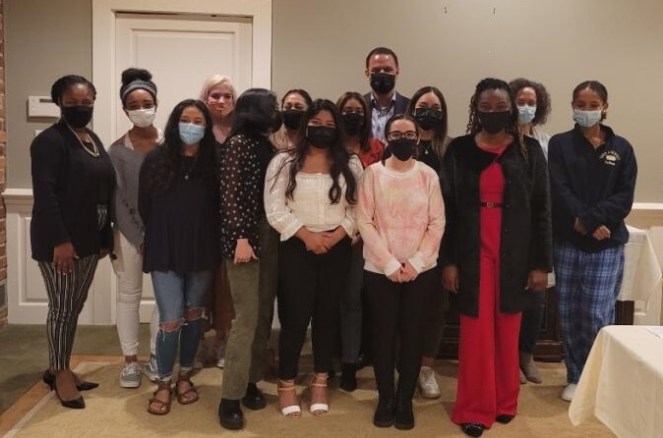 Dinner with Krishauna (l), Guilford students (Multicultural Leadership Scholars Program), and Kyle Farmbry (rear), incoming Guilford president.